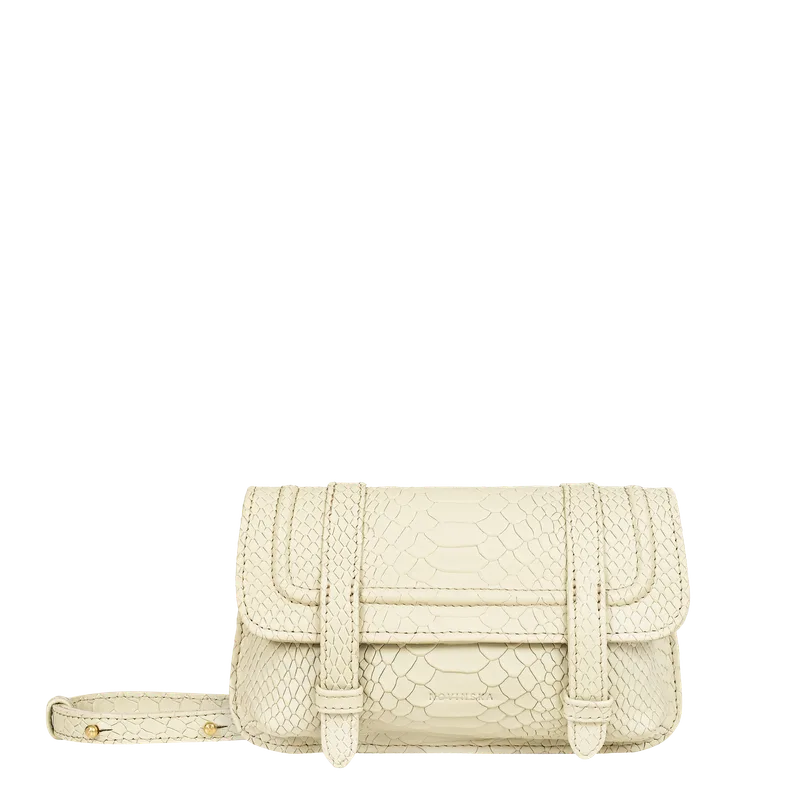 Mini torebka, która zmieści telefon i najważniejsze drobiazgi, które chcesz mieć zawsze pod ręką. Wszechstronna — możesz nosić ją na skos, w talii lub na biodrach. Praktyczna, a jednocześnie na tyle wyrazista, by nadać każdej stylizacji charakter. Kompaktowa, funkcjonalna forma z modowym sznytem idealna do letnich stylizacji, jeansów, czy lnianej koszuli. Torebka wykonana z miękkiej skóry z tłoczeniem w łuski pytona w subtelnym odcieniu kremowym / kości słoniowej. Zapinana na dwa kryte magnesy, dodatkowo zabezpieczona paskami ze szlufkami. Regulowany pasek umożliwia różne sposoby noszenia. Dyskretne okucia w kolorze złotym. Wnętrze wykończone płócienną podszewką w jasnym kolorze, ze skórzaną kieszonką na karty. Zaprojektowana i wykonana w naszej pracowni w Warszawie. Pakowana w worek przeciwkurzowy z logo.