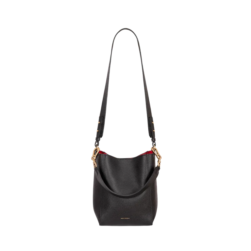 Nowoczesna interpretacja klasycznego worka. GRACE jest kobieca i wyrazista, a subtelny twist sprawia, że nie da się przejść obok niej obojętnie. Model GRACE inspirowany jest legendarną Grace Kelly — ikoną stylu, której elegancja i kobiecość do dziś pozostają ponadczasowe. Kompaktowa, średniej wielkości torebka, a jednocześnie pojemna. Ma dwa dopinane paski: krotką rączkę na ramię i długi skórzany pasek. Profilowana rączka wygodnie układa się na ramieniu lub opada na ozdobnych karabińczykach, a szeroki, regulowany pasek pozwala nosić ją także na skos. Wykonana z miękkiej skóry z fakturą grochu w kolorze czarnym. Wnętrze wykończone zamszową skórą w kontrastowym kolorze czerwonym. Zapinana na kryty magnes. W środku odchylana kieszonka i portfelik na suwak na smyczce z karabińczykiem. KOLOR: czarny + wykończenie w czerwieni MATERIAŁ: włoska skóra bydlęca z fakturą grochu, odporna na zarysowania ZAPIĘCIE: kryte magnesy OKUCIA METALOWE: złote ŚRODEK: skóra zamszowa, odchylana kieszonka ze skóry, smycz z karabińczykiem i portfelik/kosmetyczka zapinana na suwak 21x13 cm Wykonana w pracowni rzemieślniczej w Warszawie. Pakowana w worek przeciwkurzowy z logo.