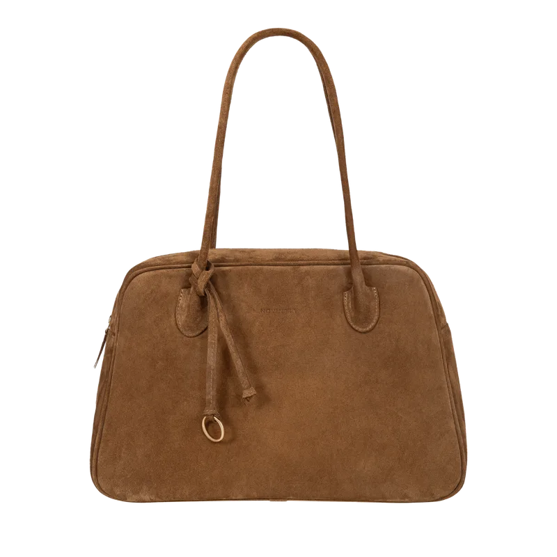 Duża zamszowa torba typu Bowling w koniakowym kolorze o trapezowym kształcie będzie idealnym wyborem zarówno na podróże służbowe (tzw. weekender bag), jak i do codziennego użytkowania, w tym jako torba na komputer i do pracy. Duża, pojemna torba o wyrazistej, trapezowej formie. Długie rączki, wypracowane z najwyższą kaletniczą precyzją, wygodnie układają się na ramieniu. Zapinana na suwak. Miękka, a jednocześnie trzyma fason. Ozdobny rzemyk z charakterystycznym dla marki pomarańczowym przeszyciem stanowi subtelny, rozpoznawalny akcent. Napisz do nas jeśli potrzebujesz kieszeń na komputer w torbie. • Materiał: włoska skóra zamszowa, impregnowana • Zapięcie: metalowy suwak YKK • Okucia: złote; metalowe stopki w dnie • Środek: bawełniana podszewka w koniakowym kolorze, kieszonki wewnętrzne na suwak, smycz na klucze Zaprojektowana i szyta w naszej pracowni w Warszawie. Pakowana w lniany worek przeciwkurzowy z logo.