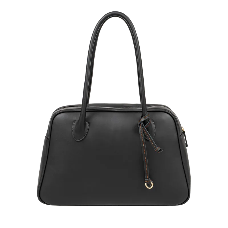 Duża, pojemna torba z gładkiej skóry licowej będzie idealnym wyborem zarówno na podróże służbowe (tzw. weekender bag), jak i do codziennego użytkowania, w tym jako torba na komputer i do pracy. Torba o wyrazistej, trapezowej formie. Długie rączki, wypracowane z najwyższą kaletniczą precyzją, wygodnie układają się na ramieniu. Zapinana na suwak. Miękka, a jednocześnie trzyma fason. Ozdobny rzemyk z charakterystycznym dla marki pomarańczowym przeszyciem stanowi subtelny, rozpoznawalny akcent. • Materiał: włoska skóra bydlęca, gładka, matowa • Zapięcie: metalowy suwak YKK • Okucia: złote; metalowe stopki w dnie • Środek: bawełniana podszewka w czarnym kolorze, kieszonki wewnętrzne na suwak, smycz na klucze Zaprojektowana i szyta w naszej pracowni w Warszawie. Pakowana w lniany worek przeciwkurzowy z logo.